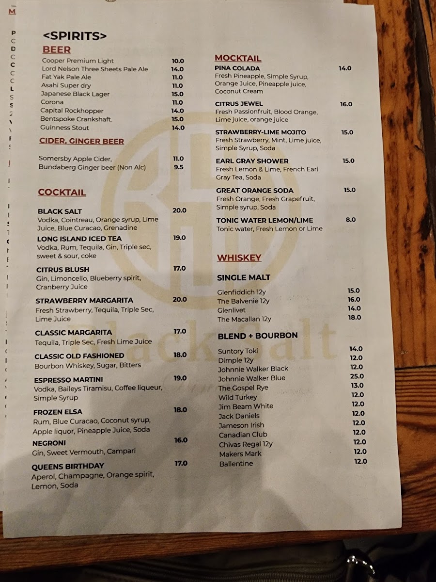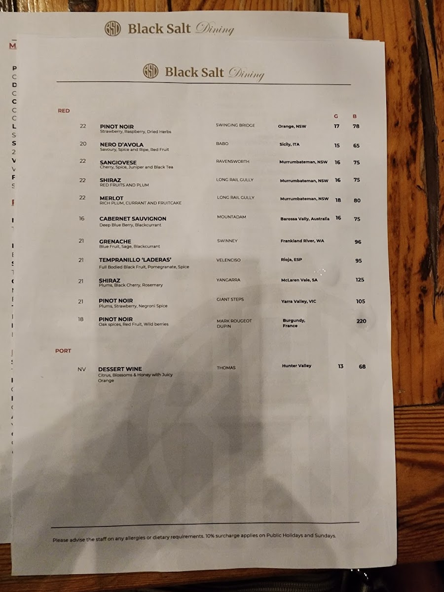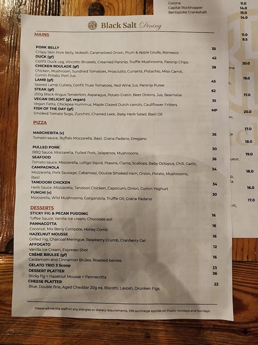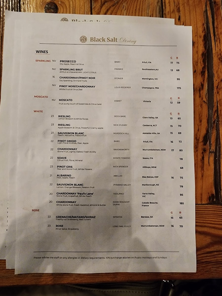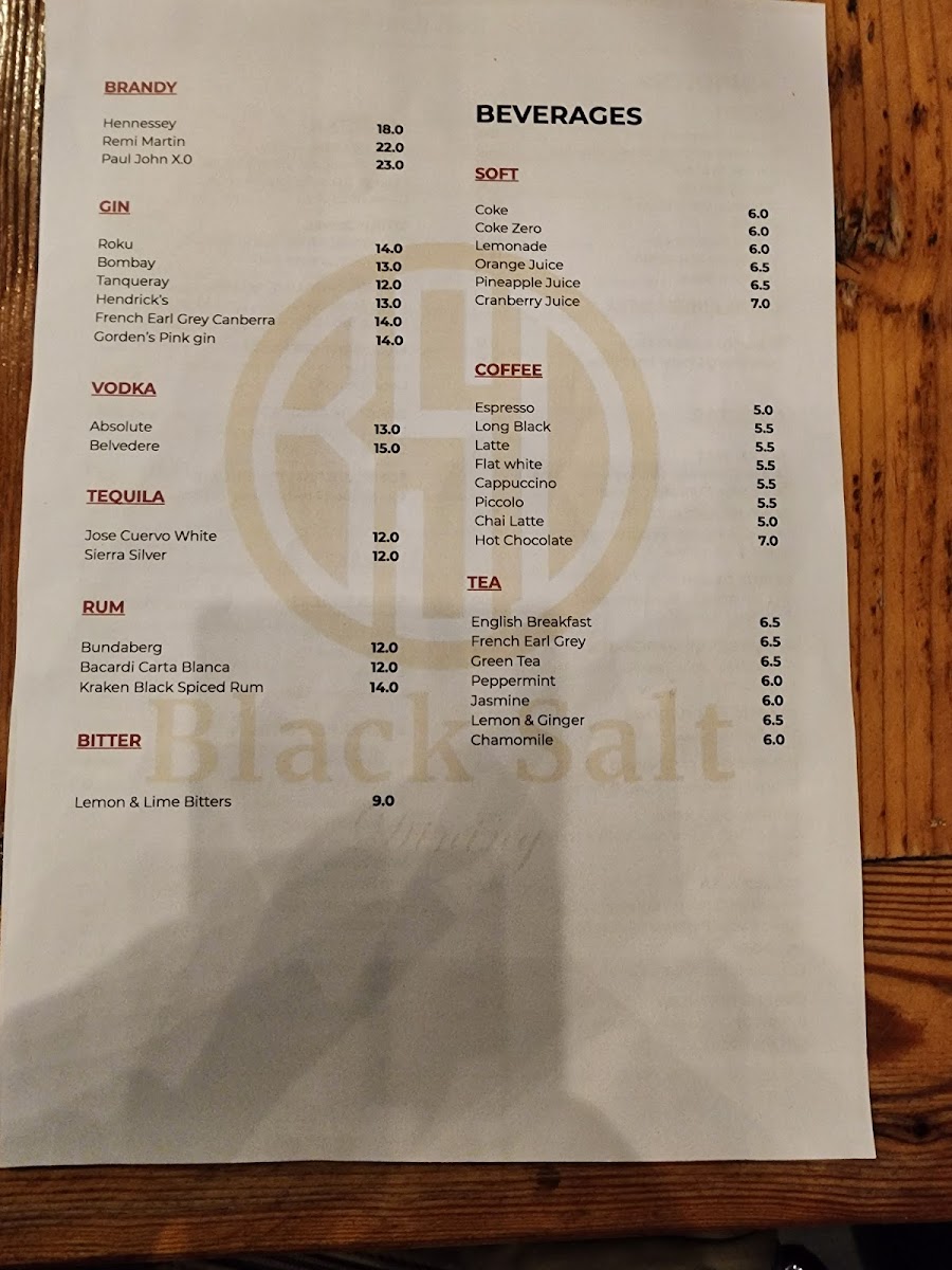 From a reviewer’s perspective, the menu at Black Salt Dining, located opposite Go Boat at 28/6 Trevillian Quay, Kingston ACT 2604, presents a well-balanced and thoughtfully curated dining experience that neatly brings together modern European influences and approachable comfort. The offering begins simply yet confidently with Sourdough under the Bread section, setting a solid foundation for the meal. Entrées such as Caprese, Croquette, Zucchini Flower, Tartare, and Capesante showcase freshness and variety, moving seamlessly between vegetarian-friendly options and refined seafood choices. Complementing the mains, the Sides selection of Greens, Fries, and Kipflers provides familiar, well-judged accompaniments. Pasta lovers are particularly well catered for, with classics like Ravioli, Gnocchi, Linguinni, Fettuccine, and Spaghetti, reflecting the kitchen’s confidence in timeless Italian staples. The beverage menu further elevates the overall experience, spanning premium spirits such as Hennessey, Remi Martin, Paul John X.O, gins including Roku, Bombay, Tanqueray, Hendrick's, and French Earl Grey Canberra, as well as vodkas like Absolute and Belvedere, and tequilas Jose Cuervo White and Sierra Silver. Non-alcoholic choices like Coke, Coke Zero, Lemonade, Orange Juice, and Pineapple Juice are thoughtfully included, alongside a complete coffee range-Espresso, Long Black, Latte, Flat White, and Cappuccino-and teas such as English Breakfast, French Earl Grey, Green Tea, Peppermint, and Jasmine. The wine and aperitif selection, featuring Riesling, Sauvignon Blanc, Pinot Grigio, Chardonnay, Soave, Grenache/Mataro/Shiraz Rosé, Prosecco, Sparkling Brut Chardonnay/Pinot Noir, and Pinot Noir/Chardonnay, rounds out the menu with elegance. Overall, the menu reads as a cohesive conclusion to the Black Salt Dining experience: versatile, well-structured, and designed to appeal to both casual diners and those seeking a more refined waterfront meal.
